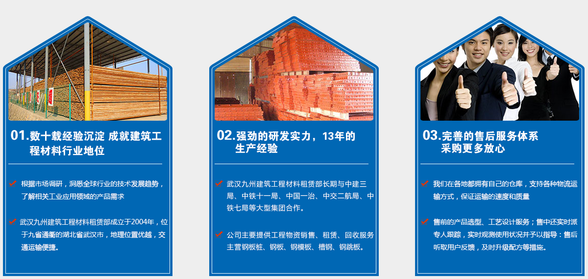 武漢市洪山區九州建材經營租賃部位于九省通衢的湖北省武漢市,北距福銀高速、大廣高速40公里,東臨京廣客運專線,南距滬蓉高速京港澳高速交匯處10公里,西距107國道、318國道20公里,地理位置優越,交通運輸便捷。主要服務于在湖北省及周邊省市進行高速公路、鐵路、房建、市政、城市軌道交通、水利、電力、廠礦等項目建設的廣大建筑企業和個人。九州建材秉承"卓越品質,誠信未來"的發展思路,以產品質量為基石,以誠信經營為方針,以客戶的利益為九州人長遠的利益。